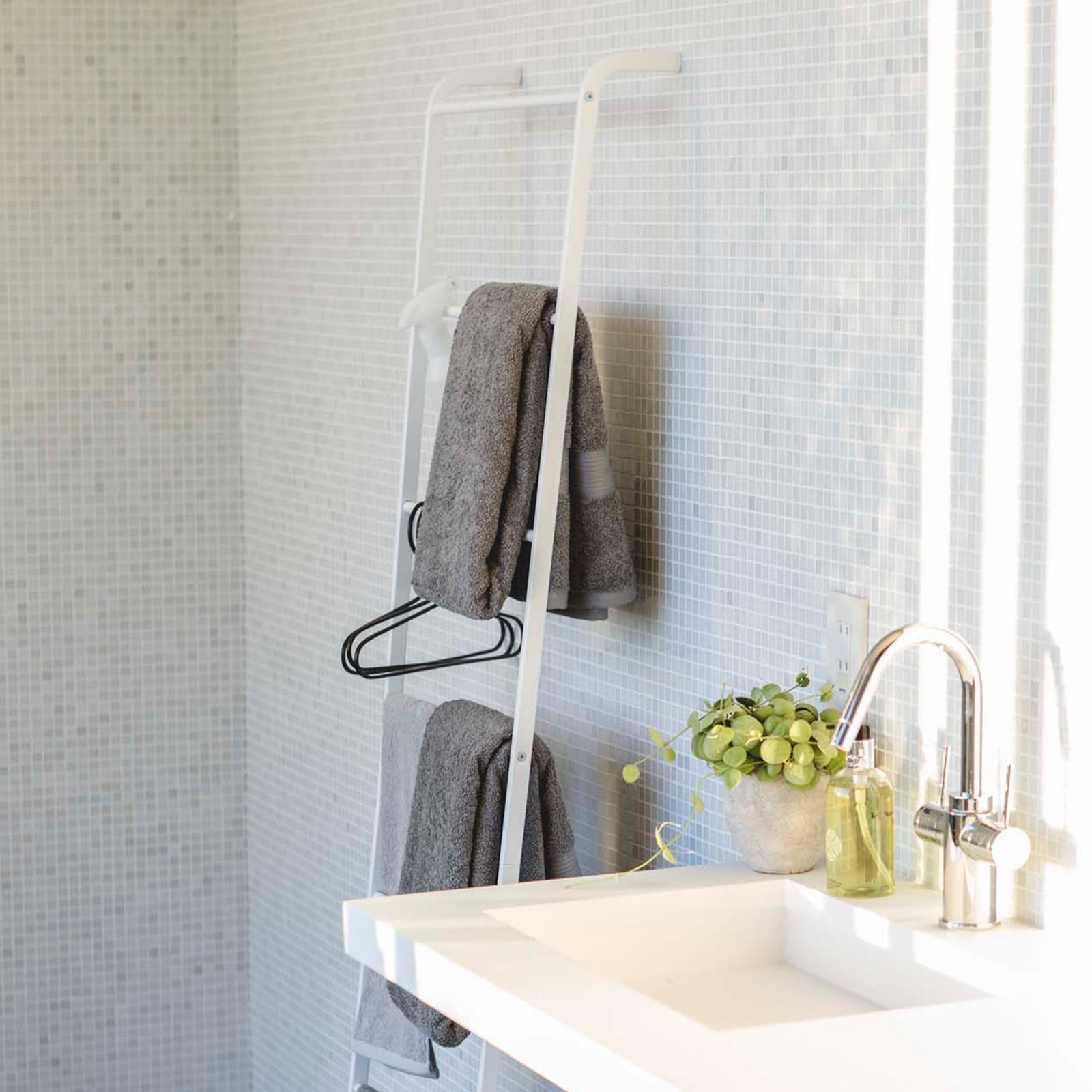 Stop drying your towels on the bathroom floor. You’ll consider yourself fortunate for the functional storage this leaning blanket ladder will add to your home. For starters, now you can finally stop drying your towel on your bathroom door. This slim adder is the perfect alternative, allowing you to hang bathroom towels and accessories. Hang clothes here instead of steaming them in the shower.