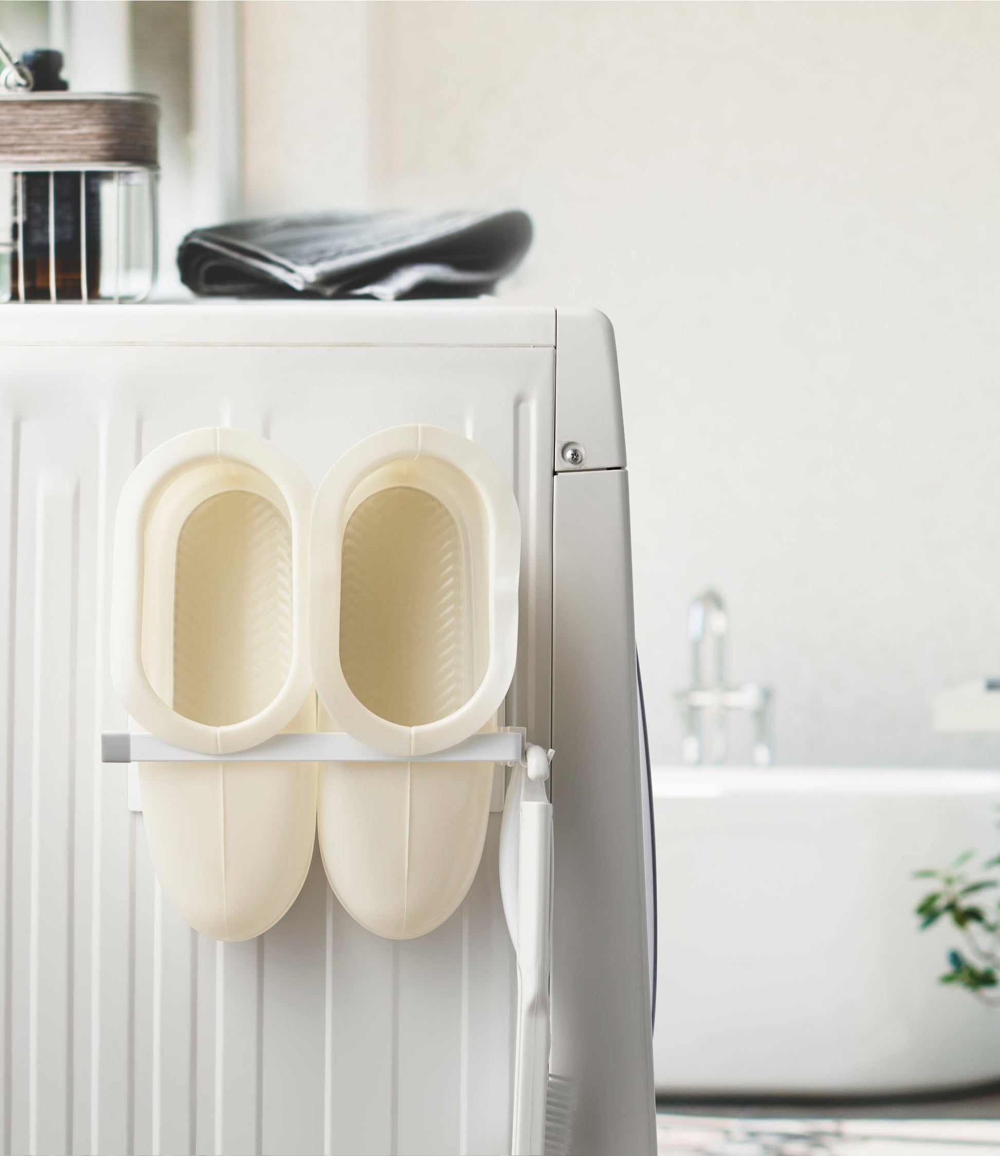 Hangers being tied up in a knot? Imagine you’re ferrying an armload of hangers to the dryer … Where do you put them? Try this simple magnetic hanging solution for your empty clothes hangers. You’ll be able to pluck your warm clothes out of the dryer and grab a hanger from this organizer easily and conveniently. For double the storage, try the two-tier hanger organizer.