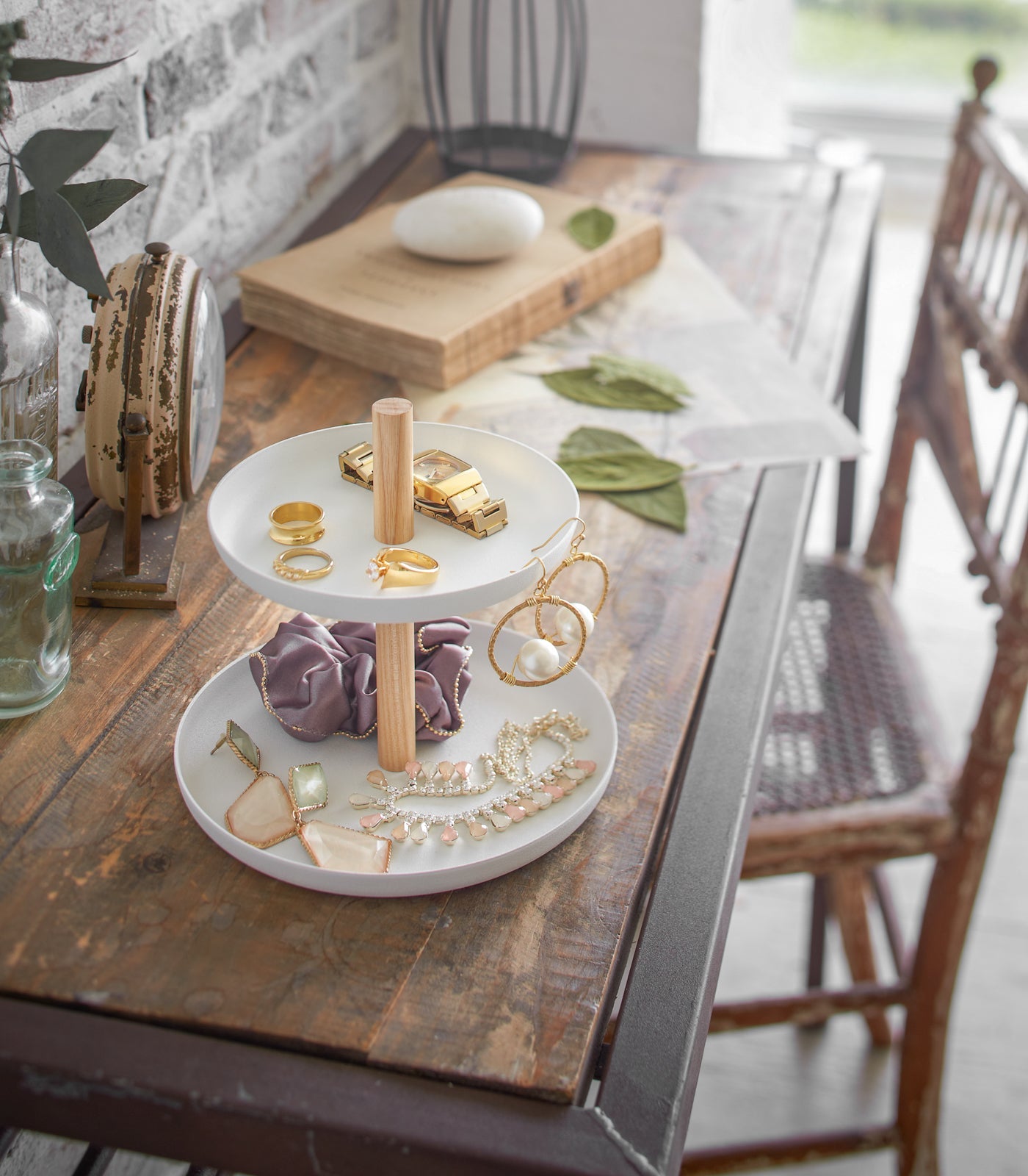 The jewelry stand to *steel* your breath away. Proudly display your precious earrings, rings, and sparkly-things. This two-tiered stand offers an elegant and enchanting place to put your dainty odds and ends. Dress up your vanity or countertop with a jewelry stand that, even by itself, is a beautiful decoration.