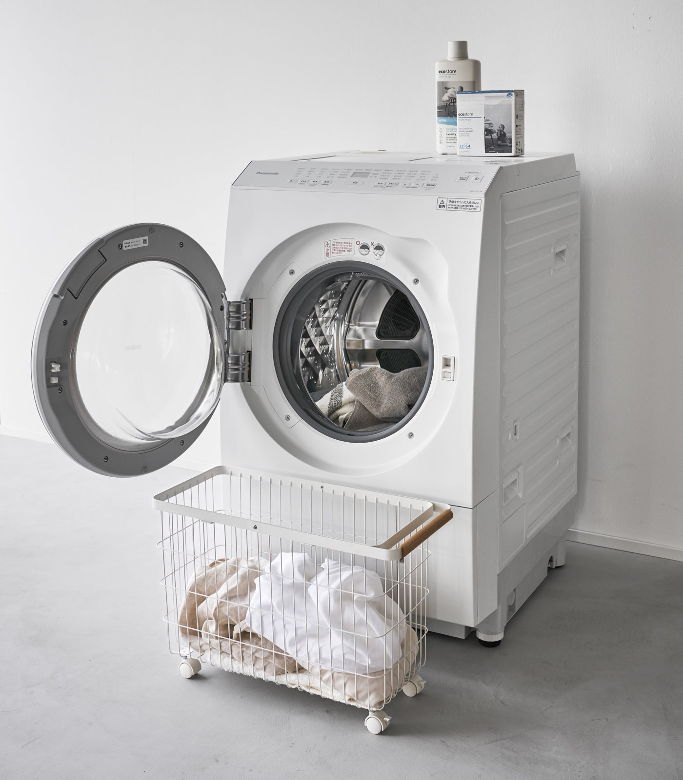 Keep your clothes washer-ready with this rolling laundry basket. This slim-profile laundry basket can hold a whole load without taking up much space. With sturdy caster wheels, it is easy to roll to and from your washer. The wire frame and wooden handles fit nearly any home aesthetic, while the narrow width and high profile make it easy to store anywhere in your home.