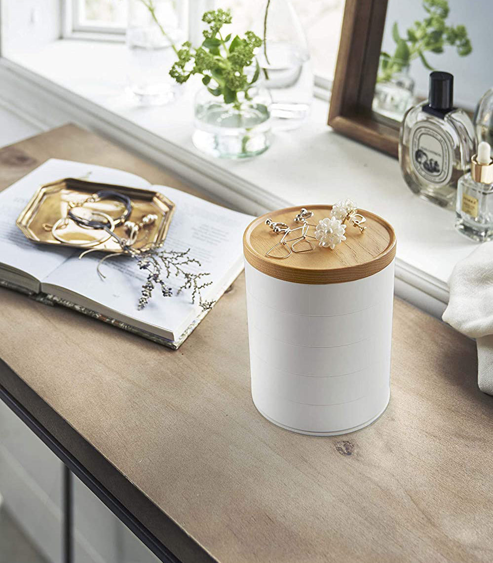 Swing into style. With a swivel and a slide, store all of your beloved accessories and trinkets in these chic organizers. Categorize your earrings, bracelets, and necklaces as you wish between the five tiers. Fan them out to let your baubles shimmer, sparkle, and shine, and close the wooden lid to protect from dust.