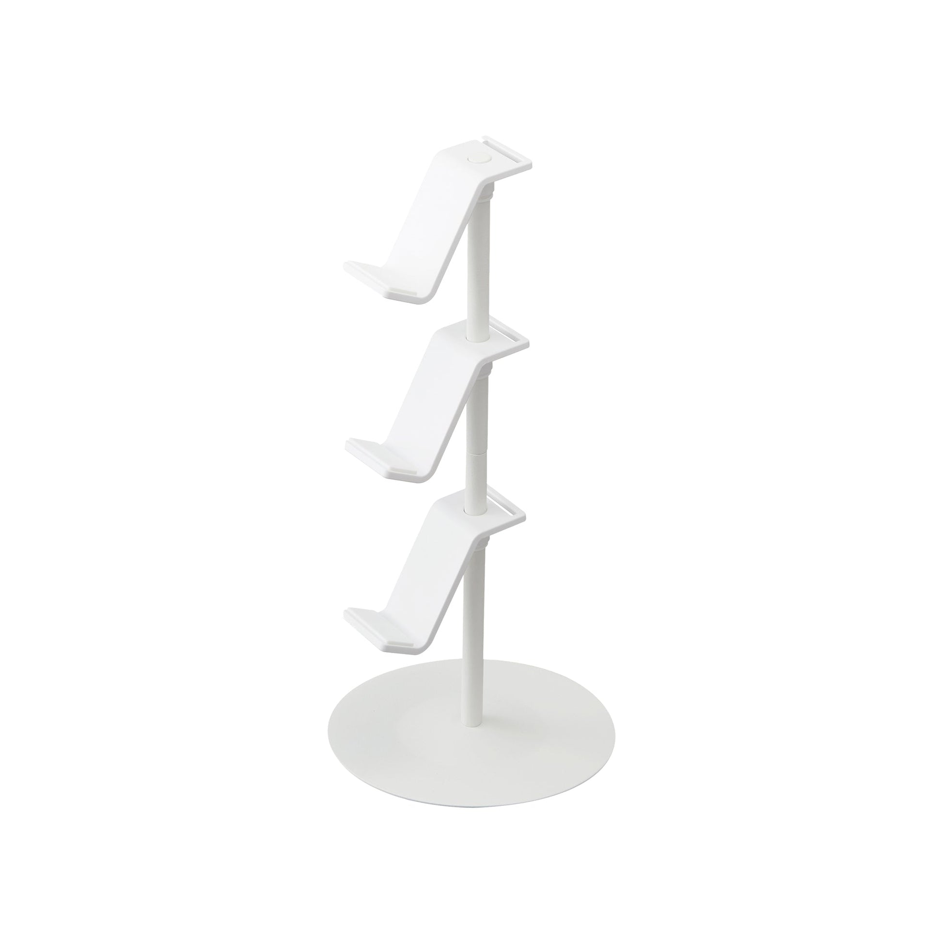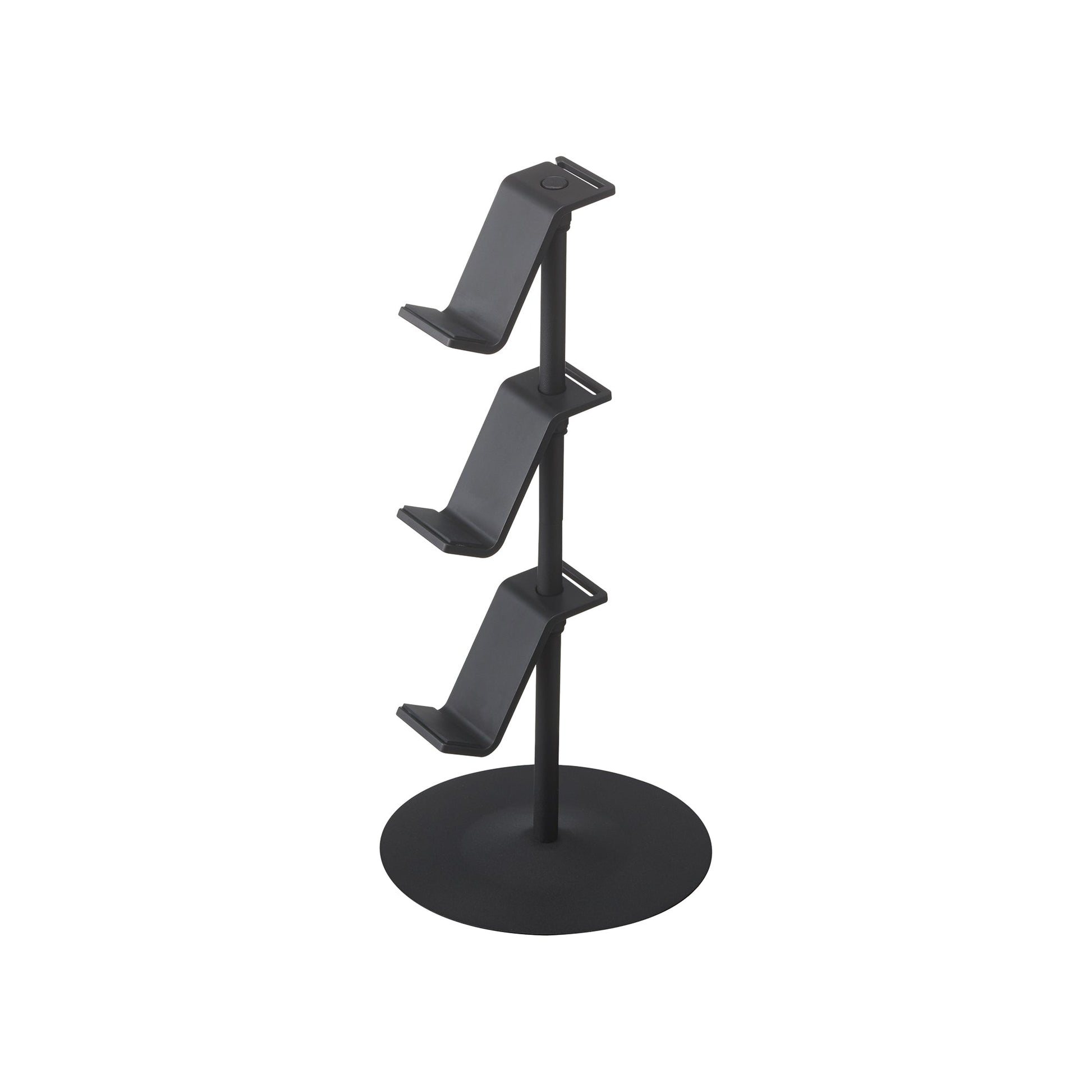 A whole new ball game for electronic organization. This controller organizer is modern, minimalist, and convenient. The height of each level can be easily adjusted by the rubber rings that each platform rests on. Each level can also spin around the axis of the sturdy steel rack, giving you ultimate flexibility with this gaming station. Three tiers for storing game controllers, headphones, or handheld electronics. Special hooks hold wires in place, acting as a charging station for your devices. How do you get to this stage of the game without one?