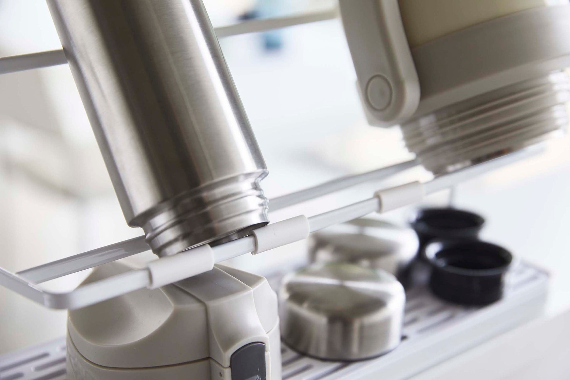 Put a smile on your mug! This mug and bottle drying stand is just the thing your sink has been waiting for. If your bottles are rolling around your dish rack, or worse tipping it over, consider a new drying solution. Dry your bottles upside down on the upper rack and store the lids below. The bottom tray is removable to shake out those drips and drops.