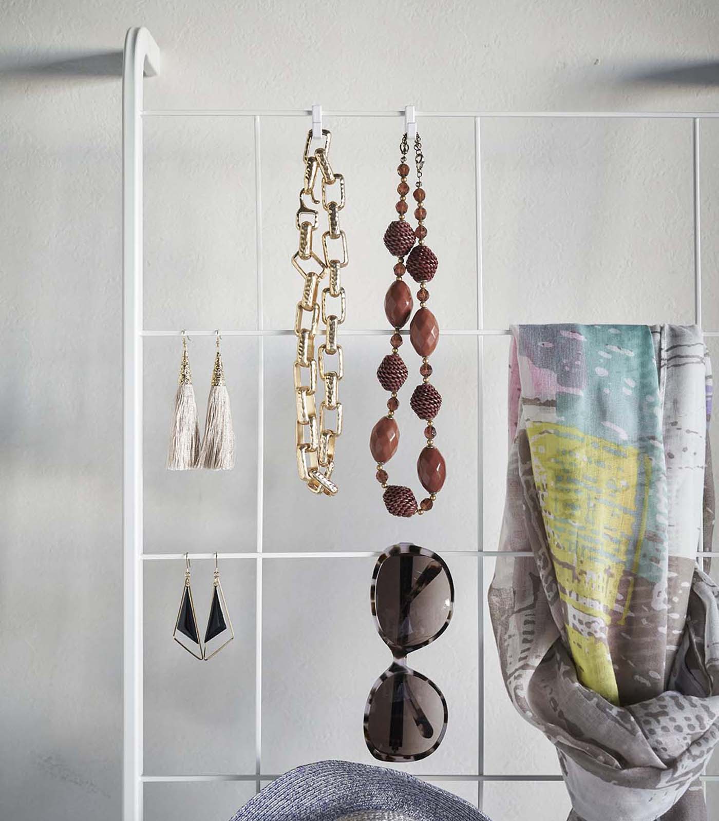 Lean into your favorite accessories. Create cleaner, clutter-slaying habits by making use of convenient catch-all ladder like this one. Make a display out of your favorite hats, scarves, glasses, and more with this useful catch-all grid. When you get home, make it your new habit to throw your accessories onto this space-saving rack rather than countertops, tables, or heaven forbid—the floor.