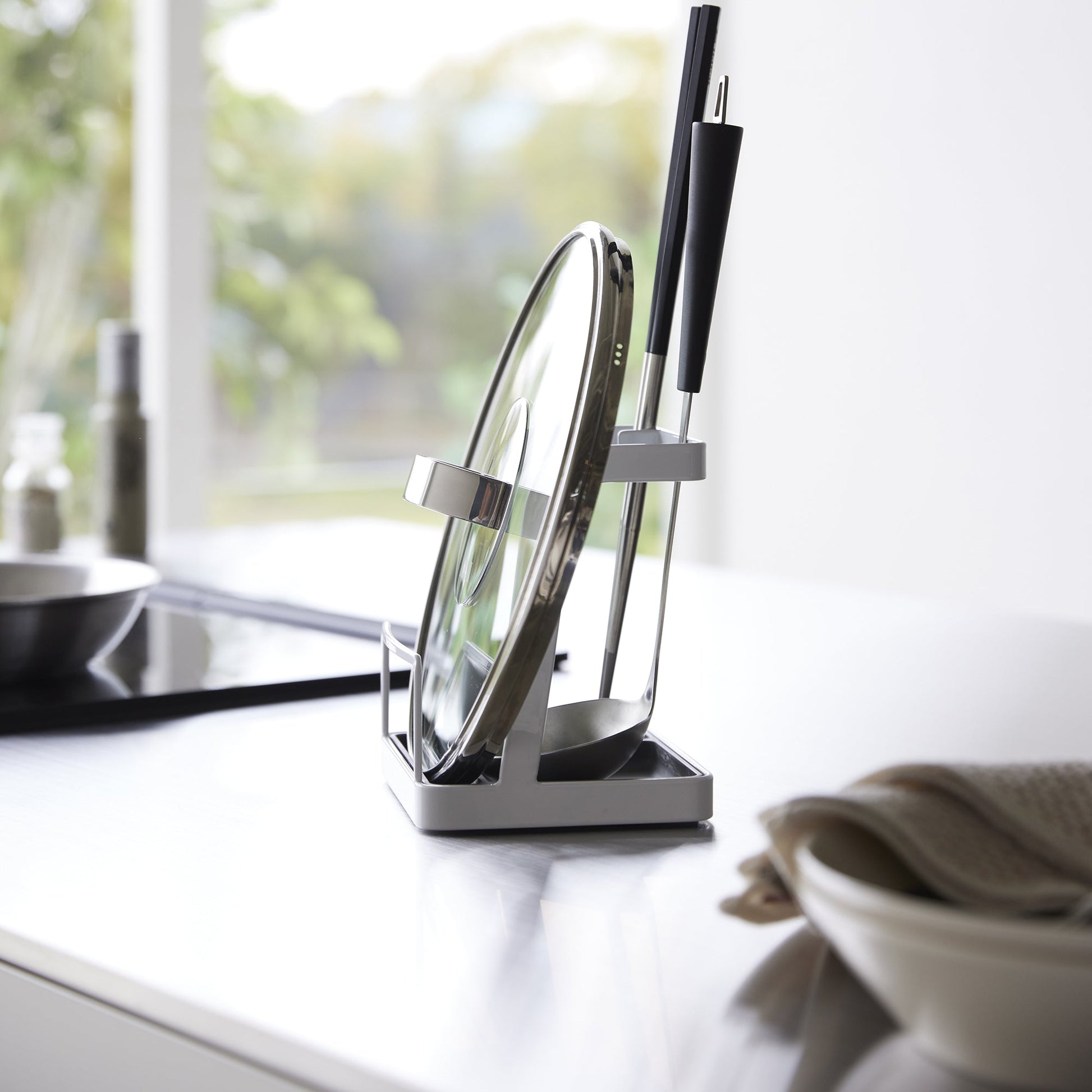 The ultimate kitchen assistant. Don’t let the minimalist design fool you! This innovative lid and ladle stand will keep your cooking utensils, and pot lids upright and off the countertops while you cook, so your kitchen remains sparkly clean. A larger size of our newest of several design iterations, this stand features two sections for resting cooking tools, as well as a rest for lids, cookbooks, or tablets. Now you don’t have to move the lid to access the upright utensils! Tray is dishwasher safe for easy cleaning.
