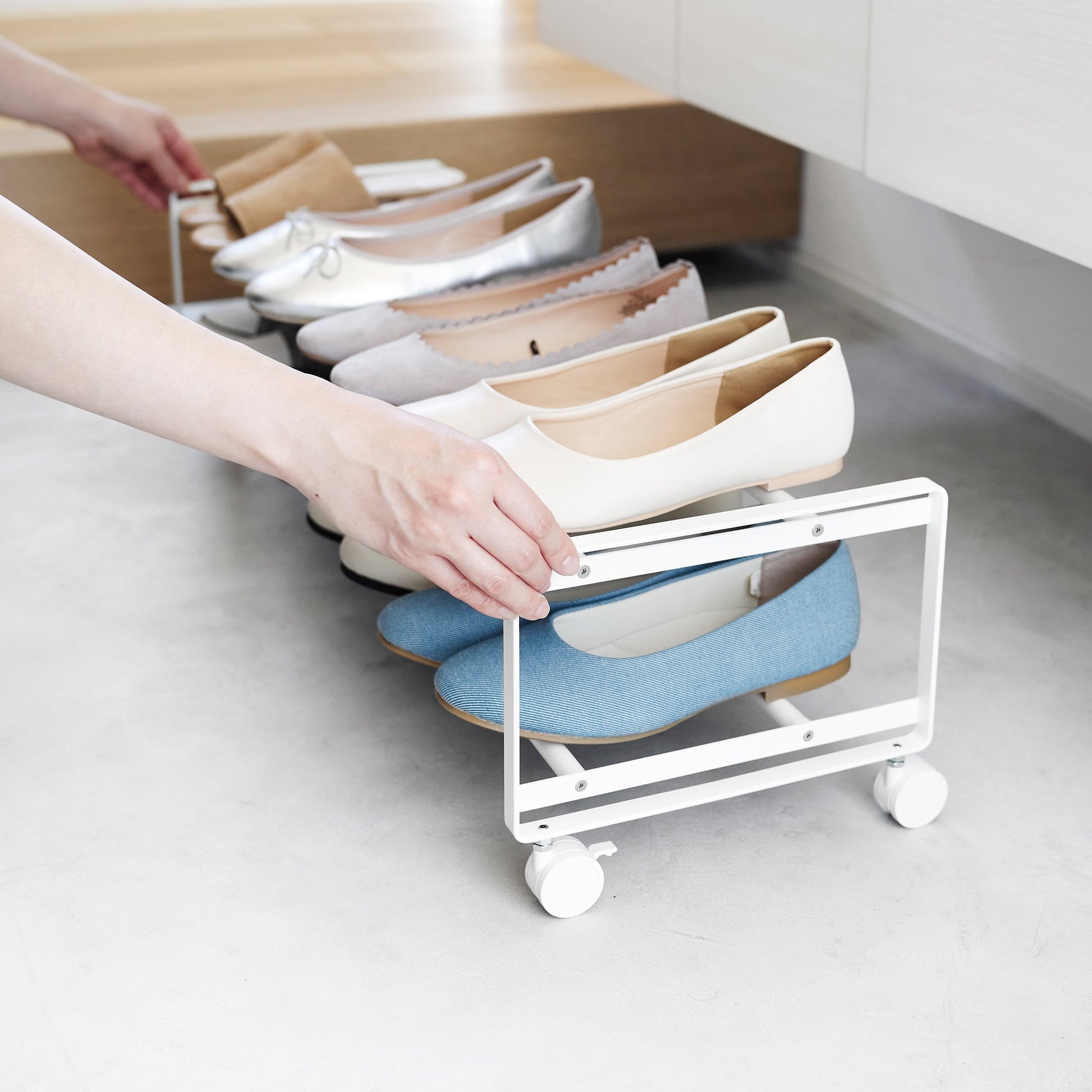 An everyday solution for your everyday shoes. Rolling, two-tier storage for those with vertically challenged storage spaces. Roll this shoe rack under a credenza, the bottom of a closet, or any other low-down space. Lock the casters in place for storage and wheel away for easy cleaning. Ready to get your shoe storage off on the right foot?