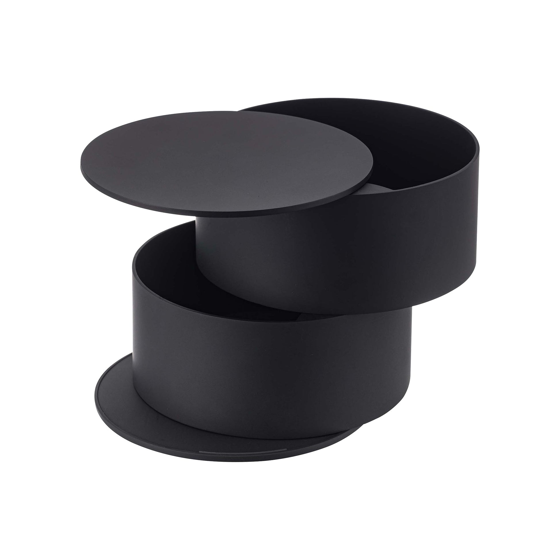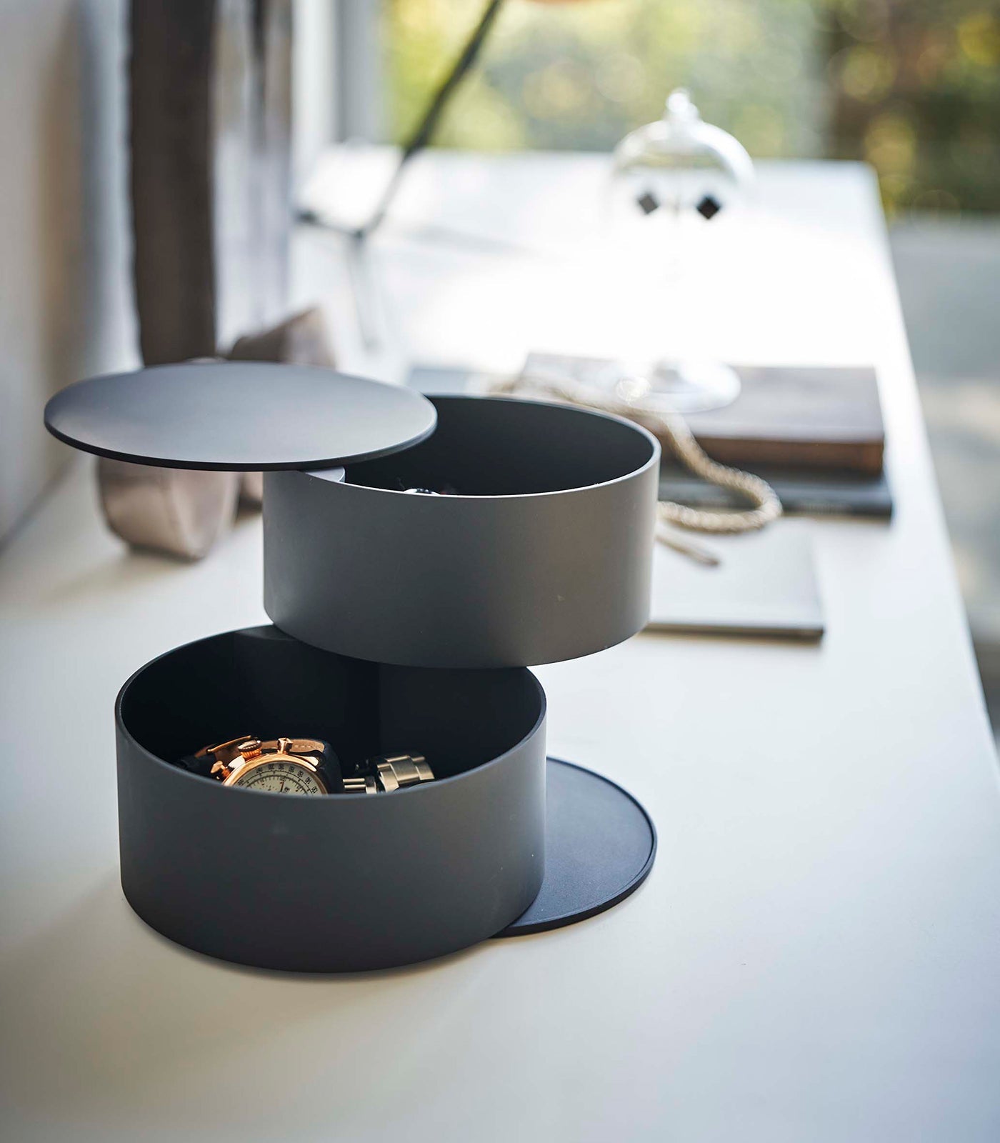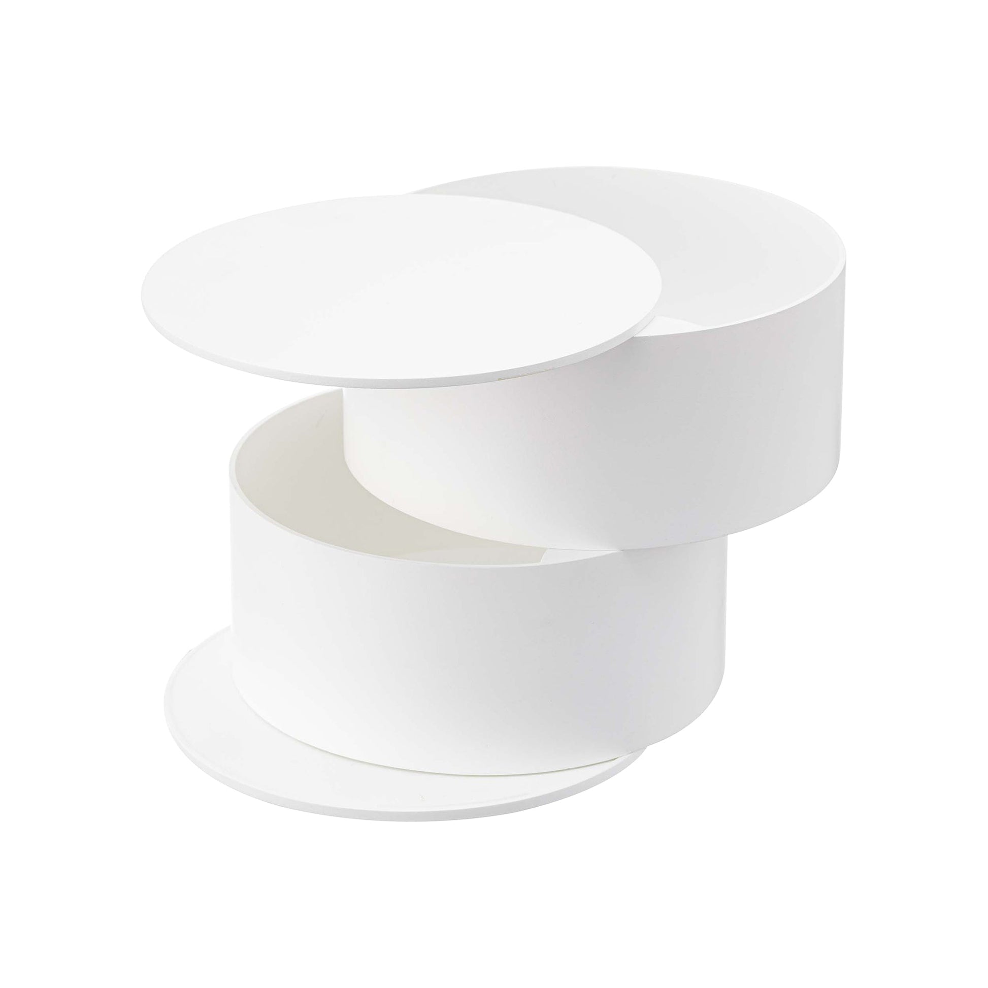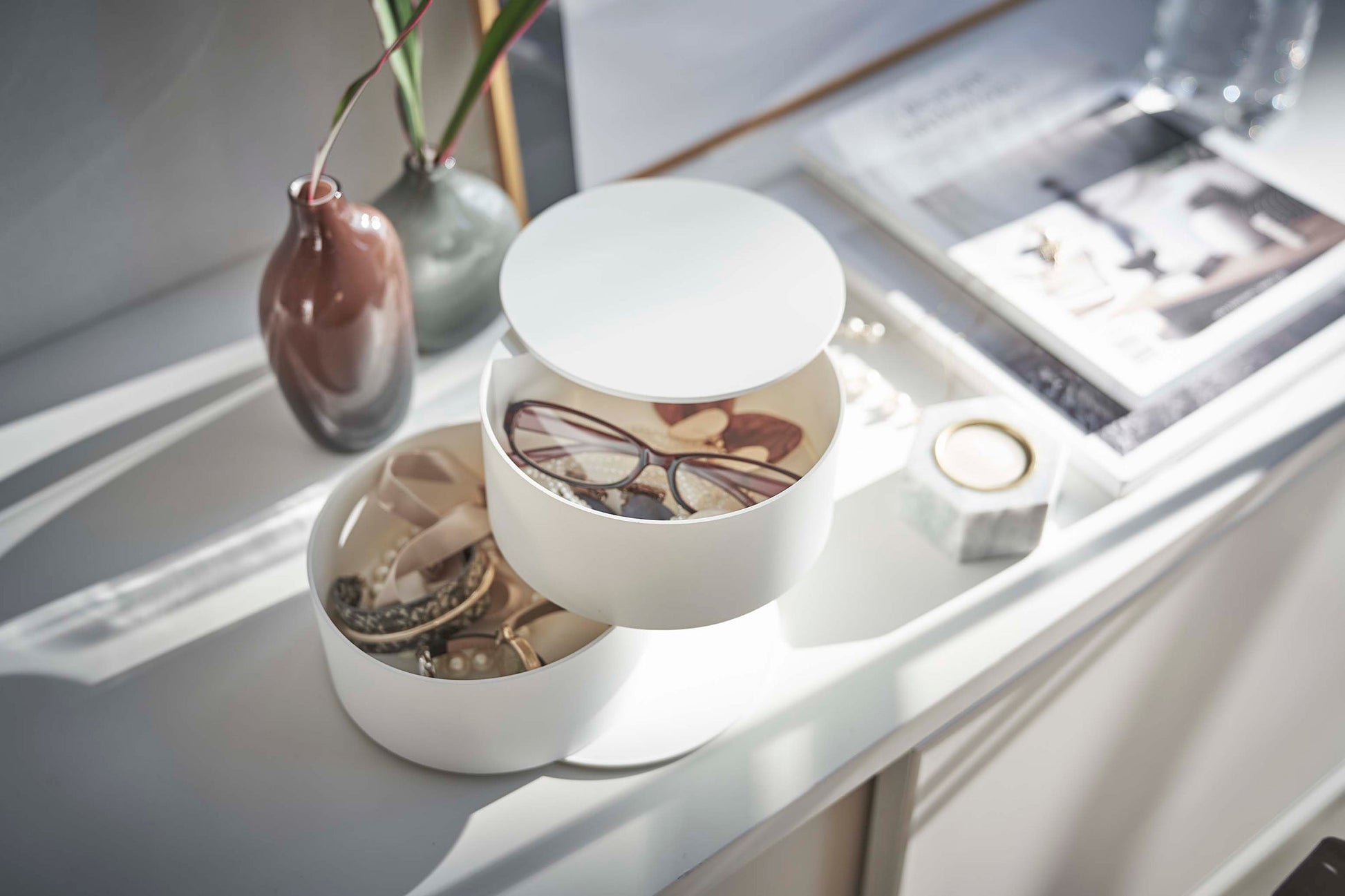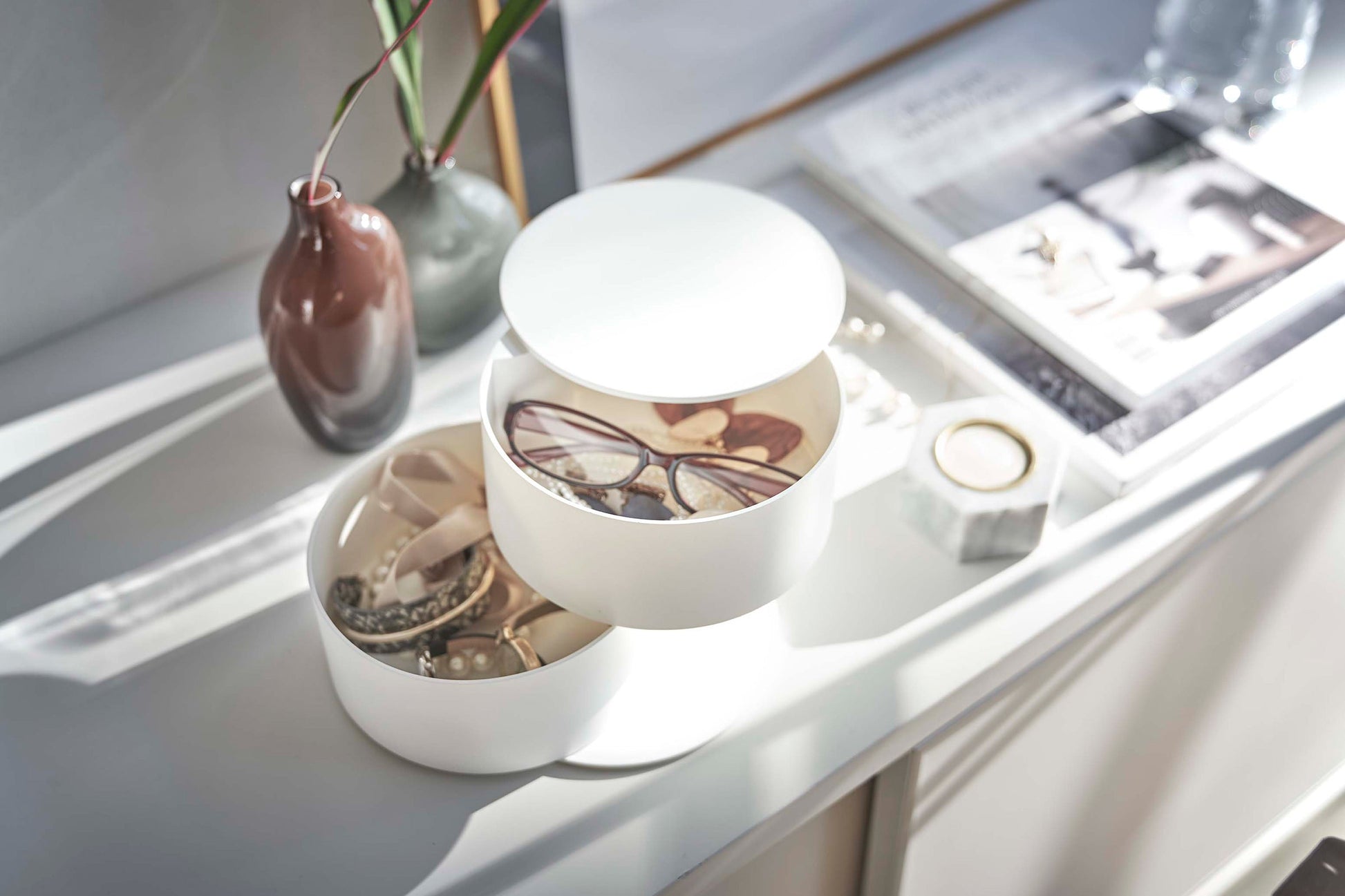 Swivel into style. With a twist and a turn, store all of your beloved accessories and trinkets in one chic holder. Let your baubles shimmer, sparkle, and shine in this two-tiered organizer. The trays are wider and deeper than our multi-tiered versions, allowing more room for larger jewelry pieces, or just more of your best gems.