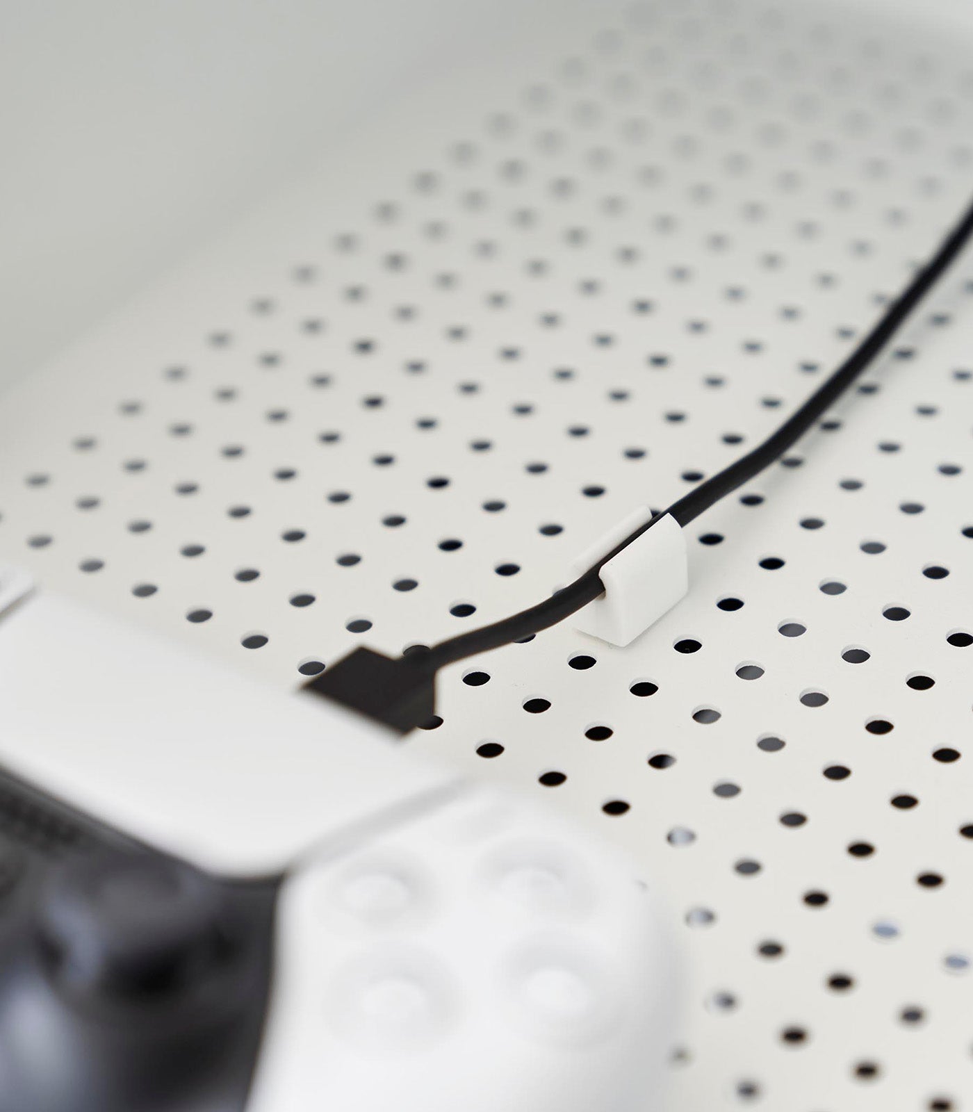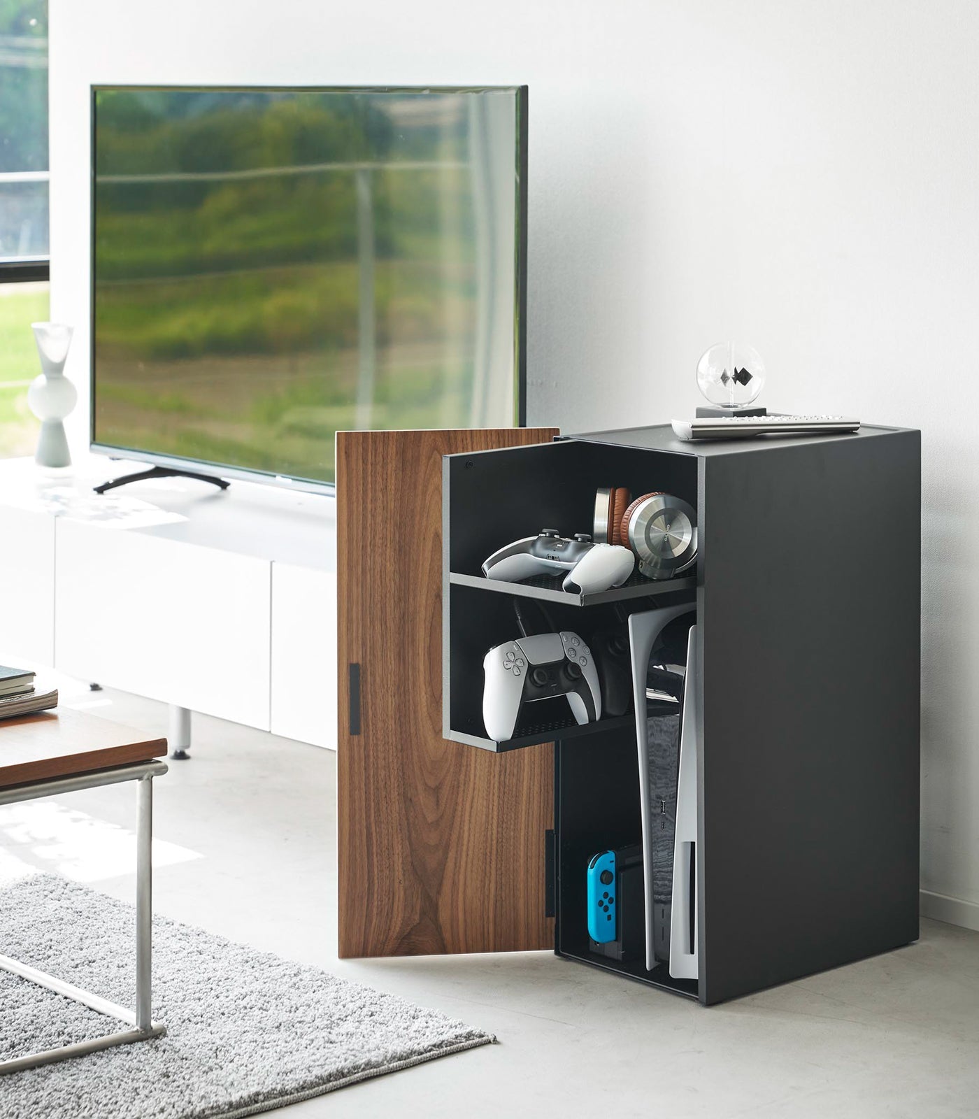 The game room game plan. Tuck away your gaming goods and upgrade your game room or living room with this spacious, all-in-one game storage cabinet. Store your game console in the bottom and controllers on the two shelves, which can be pulled out for easy access. The embedded silicone cable holders keep your cords tangle-free, while the back of the rack features a slatted design for ventilation and easy cable routing.